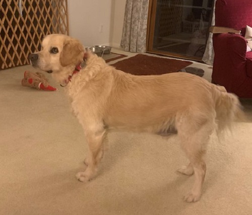 Ranger would do best in a ranch style home as stairs would be difficult for him to negotiate.  He is fine with low energy dogs but my neighbors”s high energy lab really spooked him.  He ignores my cat.  A quiet atmosphere would probably be best for him.his handsome active boy is a typical young golden retriever. He’s as sweet as they come and loves to snuggle.